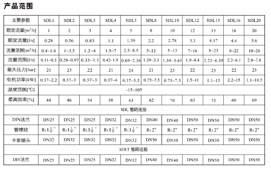 SDL8/SDLT8是一種多功能產(chǎn)品,可以輸送從自來水到工業(yè)液體的各種不同介質(zhì),適用于不同溫度、流量和壓力范圍。